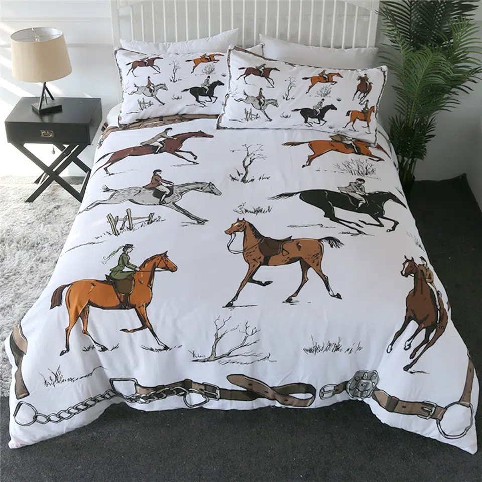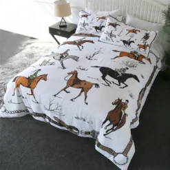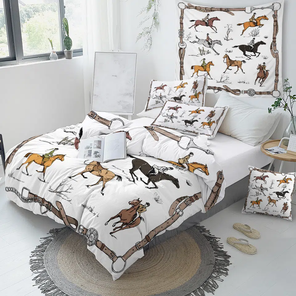 La couette est fabriquée à partir de tissu doux et respirant qui vous offrira une nuit de sommeil confortable et relaxante. Cette parure de lit est facile à entretenir et peut être lavée en machine. Vous serez certainement ravi de la qualité et du style de cette parure de lit à motifs chevaux équitation.