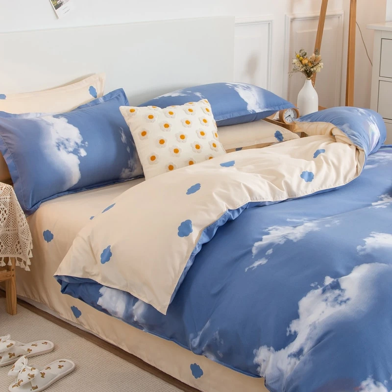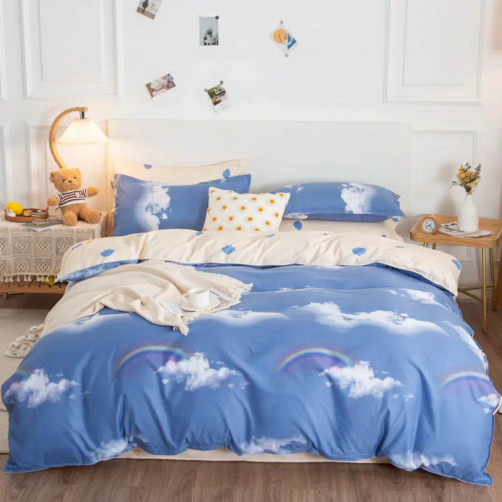 Un beau bleu, couleur du ciel, avec quelques nuages et arc-en-ciel parsemĂ©s. Cette belle parure de lit bleu ciel et nuages remplit sa fonction de vous faire dormir dans un beau dĂ©cor.Â