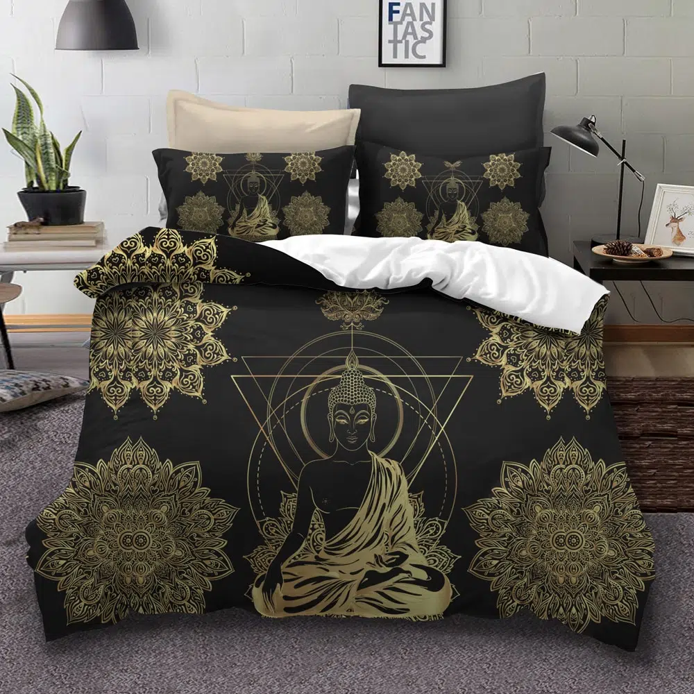 Cette parure de lit bouddha roi se distingue par la subtilitĂ© de son coloris dorĂ© sur fond noir Ă lâextĂ©rieur et blanc Ă lâintĂ©rieur, pour encore plus de contraste. Â