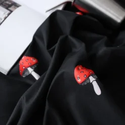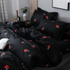 Amoureux des champignons, vous allez ĂŞtre ravie de cette parure de lit pourvue de millier de champignons rouges. Ils font ressortir le noir de cette parure et apportent une touche de mignonnerie Ă votre chambre.