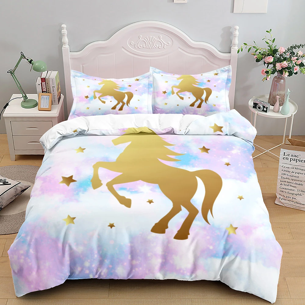 Cette parure de lit licorne dorée est idéale pour les enfants qui adorent tout ce qui brille et rayonne. Elle offre non seulement à votre enfant un endroit douillet pour dormir, mais sa décoration lui rappellera quotidiennement le pouvoir des fées et des rêves. Les tons violets et or adoucissent l’ensemble et donnent à ce décor une touche magique supplémentaire ! Profitez avec vos enfants d’un sommeil doux avec cette superbe parure !