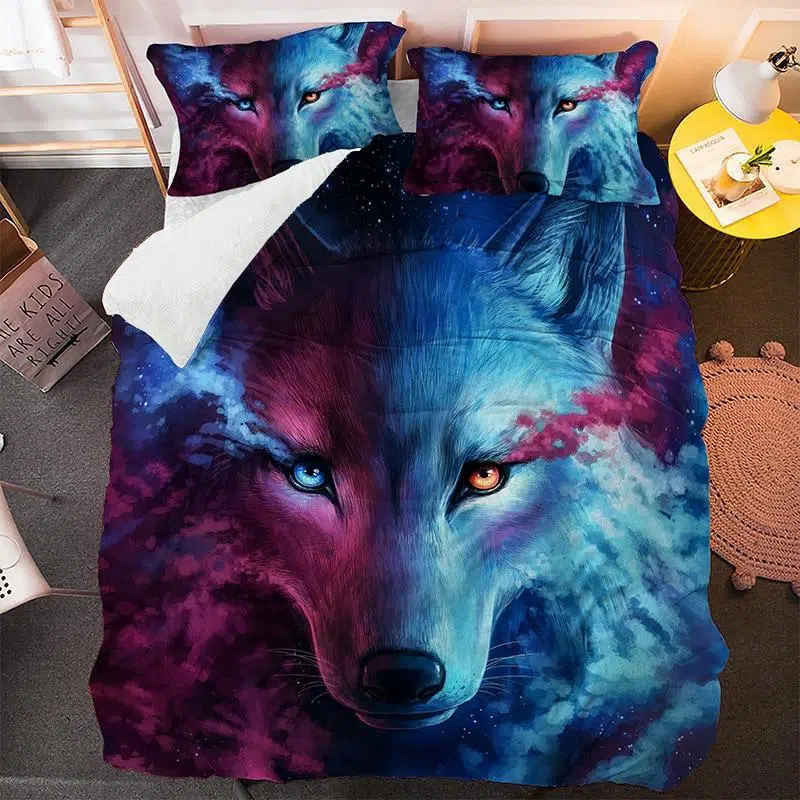 Vous allez apprécier dormir dans cette magnifique parure de lit loup aux yeux vairons. Sans doute cette parure de lit vous donnera force de la Nature et communion avec cet animal. Nous vous souhaitons de belles nuits.