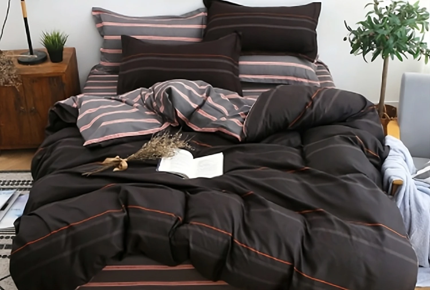 Une parure de lit discrète qui apportera une touche de rĂ©confort Ă votre chambre avec ce noir et ses rayures rouges. Passez des nuits douces et agrĂ©ables avec cet ensemble.Â