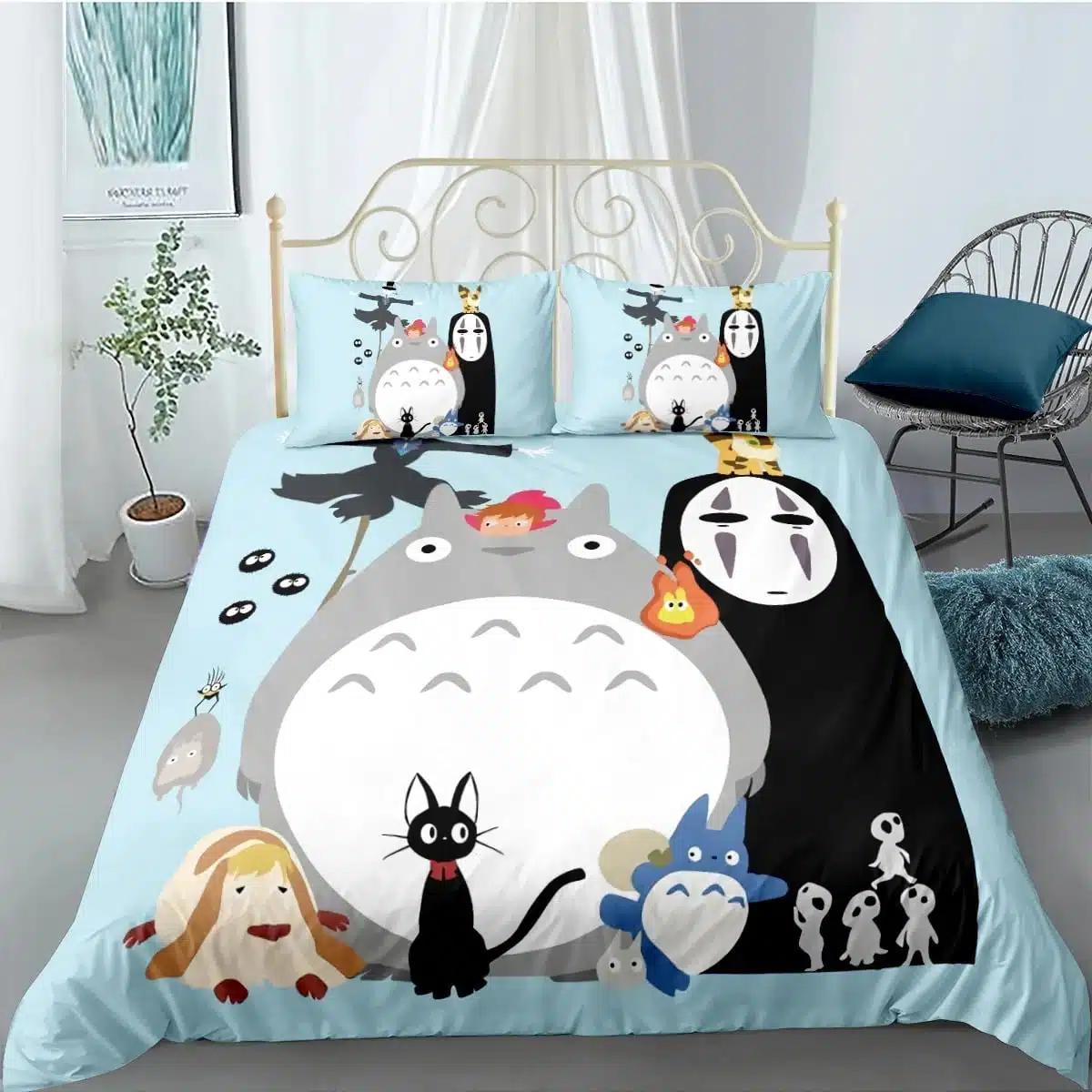 Notre parure de lit est conçue pour offrir une expérience de sommeil confortable et agréable, tout en apportant une touche de magie et de douceur à votre chambre. La parure de lit est composée d’une housse de couette et de deux taies d’oreiller assorties, toutes ornées de magnifiques illustrations représentant Totoro, le personnage principal du film, ainsi que ses adorables amis.